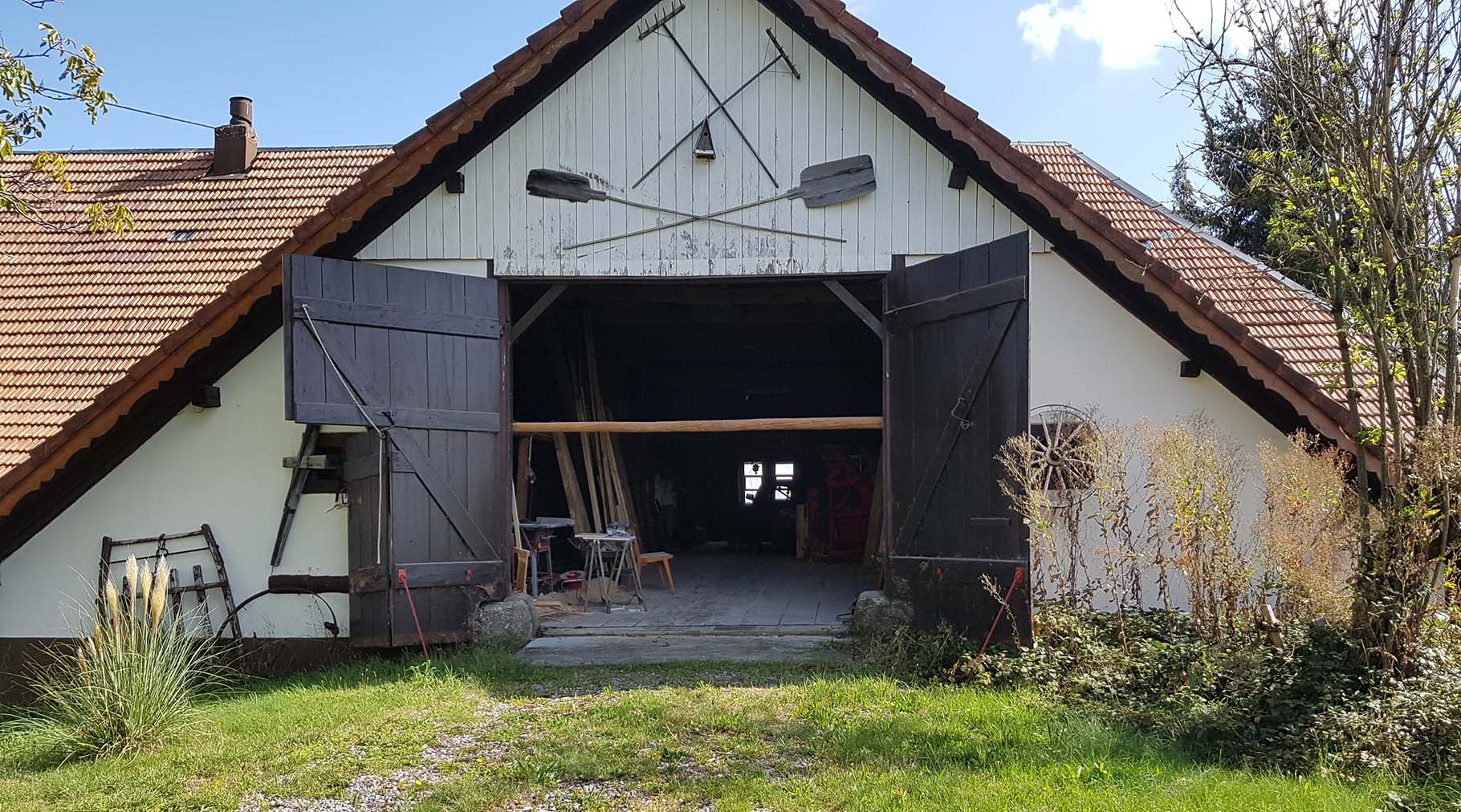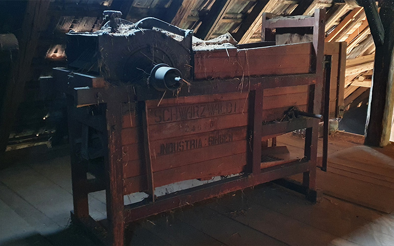 Das Gebäude ist interessant, weil es erstmals für ein Hotzenhaus den Übergang von der reinen Firstständerkonstruktion zu einer Mischform mit der traditionellen Firstständerkonstruktion im Ökonomieteil und einem liegenden Stuhl über dem Wohnteil zeigt. Beeindruckend die Firstständerkonstruktion. Hier laufen starke lange Hölzer vom Erdgeschoss bis zum First und ihre Aufrichtung bedurfte vieler starker Männer.